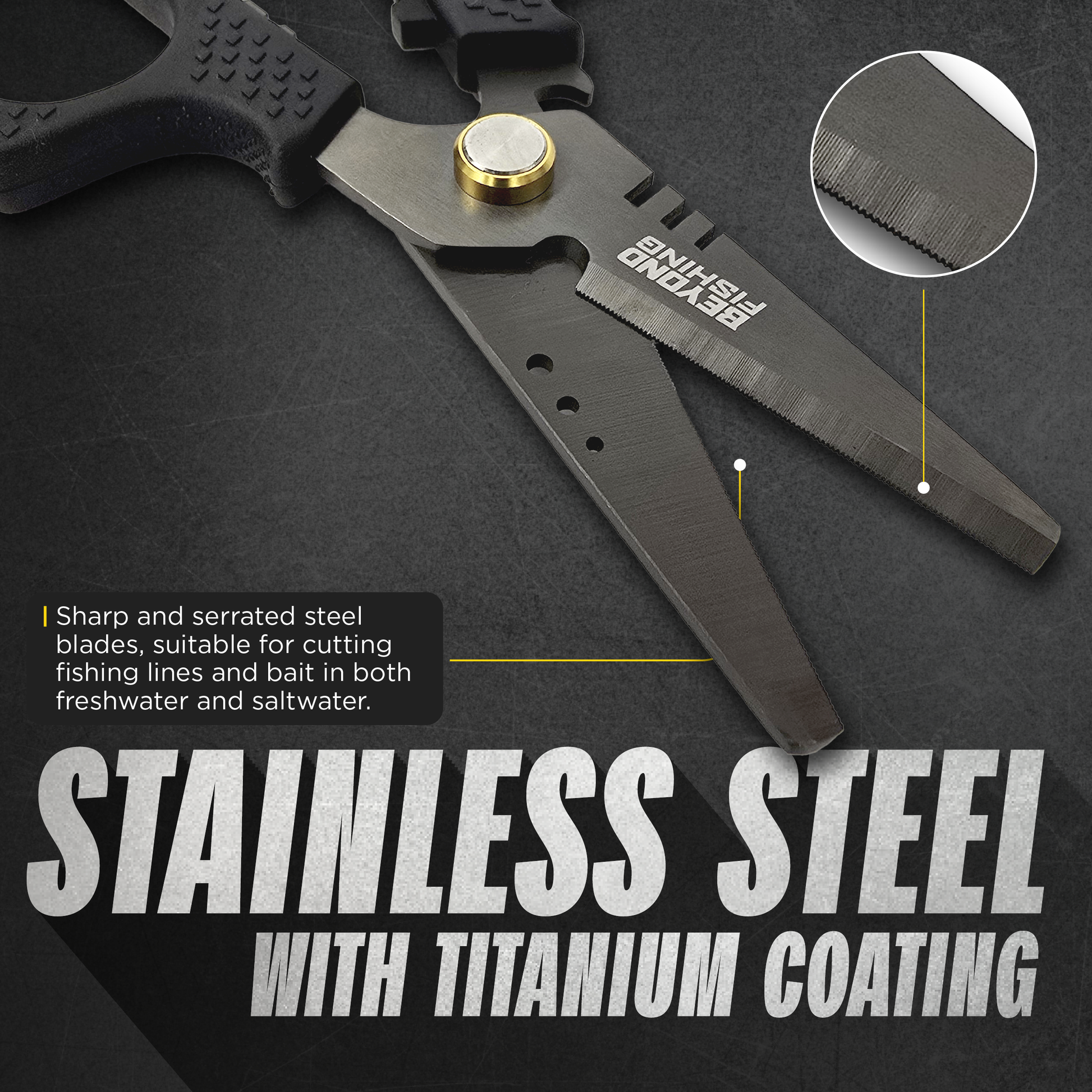 - 5CR15 STAINLESS SHARP BLADES – The super sharp 5CR15 Stainless Steel cutting blades are serrated to make cutting braided line, bait, and fish easy in both fresh and saltwater conditions. It also cuts through mono, fluorocarbon, and certain steel wire.